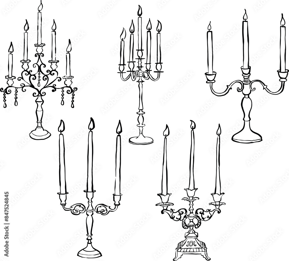 Ilustración de velas dibujadas a mano. Juego de porta velas decorativo