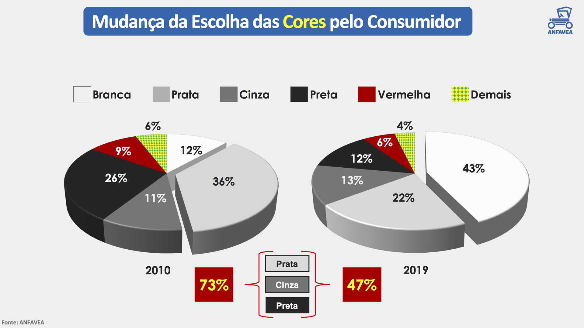 Como no ano passado, a procura pelo prata continuou diminuindo neste ano e atingiu apenas 9%. No total, as quatro cores ( branco, preto, cinza a prata ) responderam por 82% do mercado global.