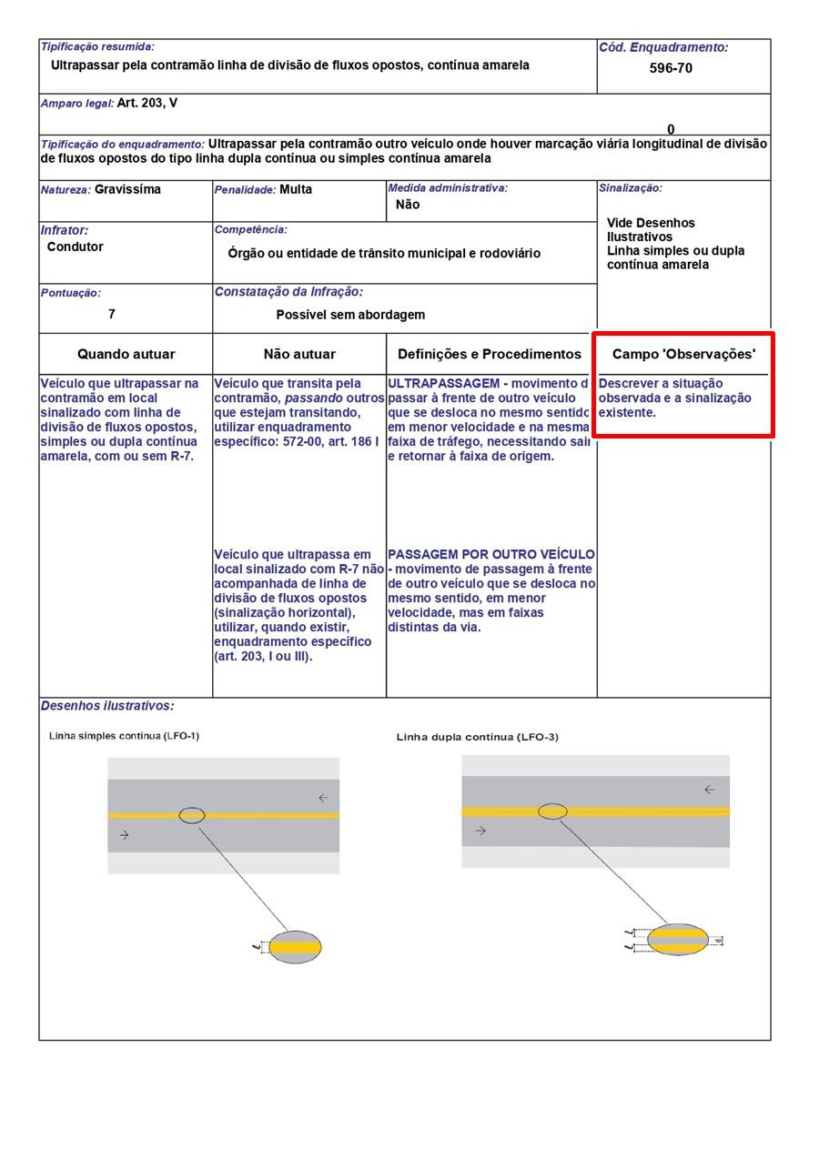 Sinalização Existente: “local com sinalização horizontal contínua amarela e vertical placa R-7 em boas condições de visibilidade diurna e noturna.” · Assim, se você perceber que esta informação NÃO consta no seu auto de infração, já terá uma excelente argumentação. Além disso, confira no AIT ou na notificação se no endereço da infração (incluindo o km relatado) se a faixa é realmente contínua e se está em boas condições de visibilidade.