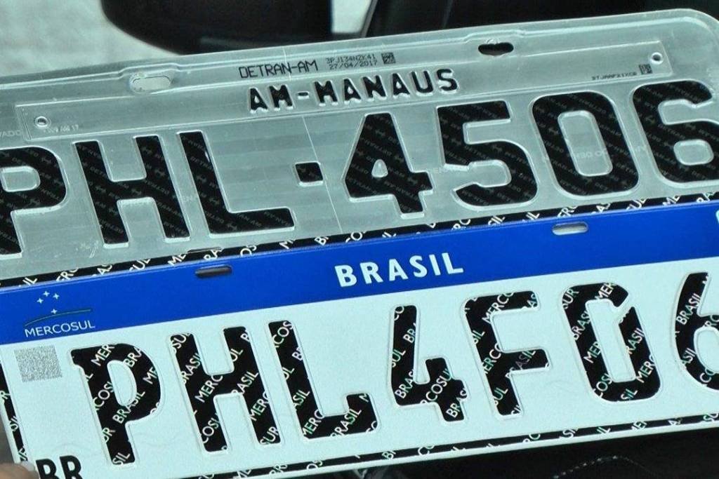 As novas placas têm sete dígitos, com quatro letras e três números, e também trazem a bandeira de cada país do Mercosul.