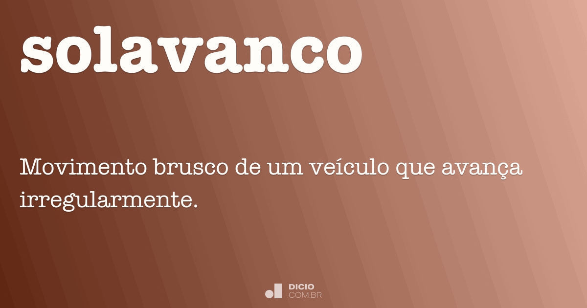 Pode consultar o significado de qualquer palavra abaixo com um clique. Experimente! Balanço imprevisto ou violento de um veículo ou da pessoa que este transporta . Avançar dando solavancos (ex.: o carro solavancava pela estrada esburacada).
